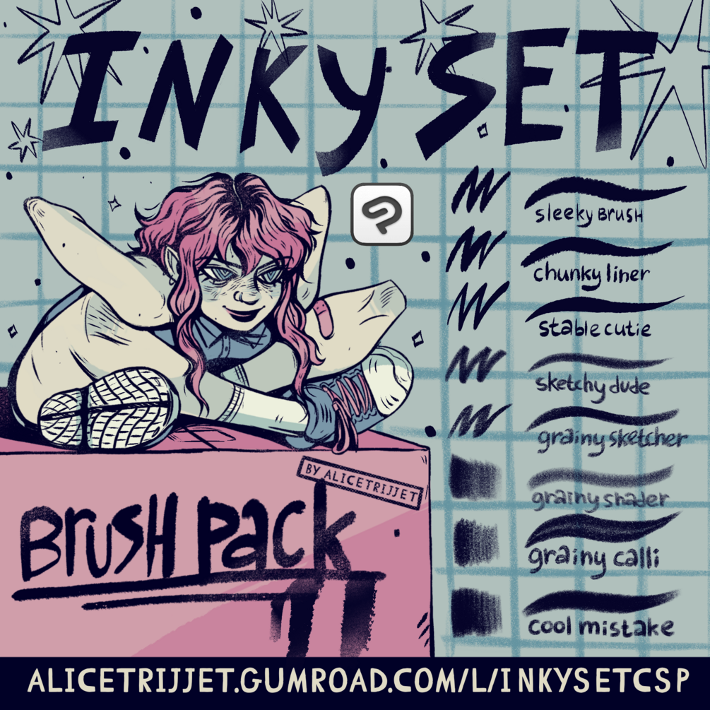 Hi! I’m Alice 💕Thanks for visiting my gumroad page! This my custom inking set of brushes for Clip Studio Paint! I use these when I’m working on a flat colored comic-y pieces. Hope you’ll find them as pleasing to work with as I do.